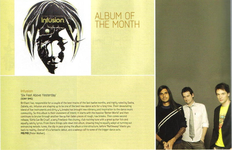 Brilliant live, responsible for a couple of the best tracks of the last twelve months, and highly rated by Sasha, Zabiela, etc. Infusion are shaping up to be one of the best new dance acts for a long time. Their devastating blend of live instruments and dirty 4/4 breaks has brought new vibrancy and inspiration to the dance music community.