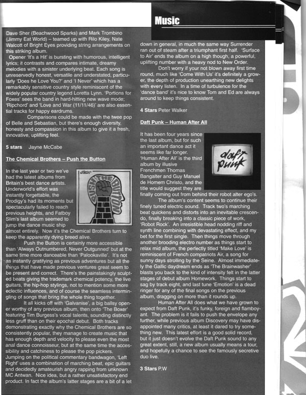 Last album ‘Discovery’ was only four years ago, but for such an essential dance act as Daft Punk, it seems like more. This is the third album by illusive Frenchmen Thomas Bangalter and Guy Manuel de Homem Christo, and it seems they’re finally coming clean from their robot alter ego’s with the album titled ‘Human After All’. The content would suggest otherwise though, as things start with standard Daft Punk robotic charm, distorted guitars and vocoder voices dominating the opener, and more of the same with track two’s marching beat speeding up and distorting into an inevitable crescendo.