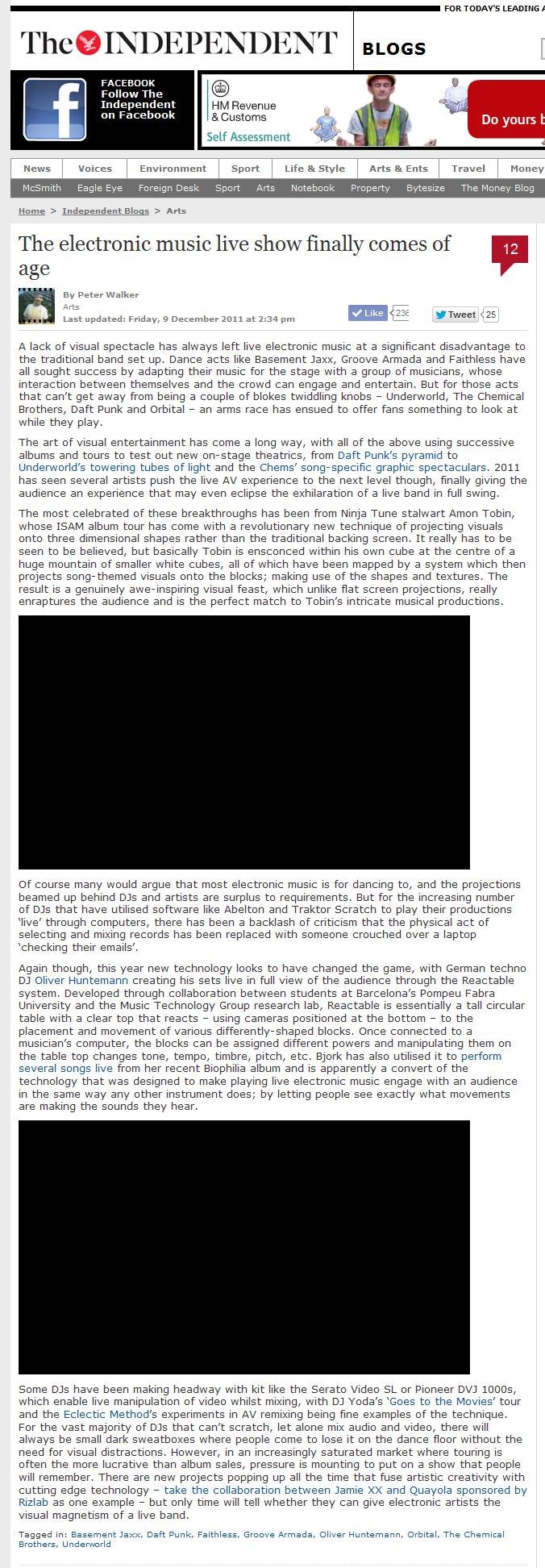 The art of visual entertainment has come a long way, with all of the above using successive albums and tours to test out new on-stage theatrics, from Daft Punk’s pyramid to Underworld’s towering tubes of light and the Chems’ song-specific graphic spectaculars. 2011 has seen several artists push the live AV experience to the next level though, finally giving the audience an experience that may even eclipse the exhilaration of a live band in full swing.